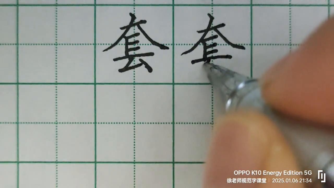 大家好,这个视频来学写套手套的套。先看老师写一遍。