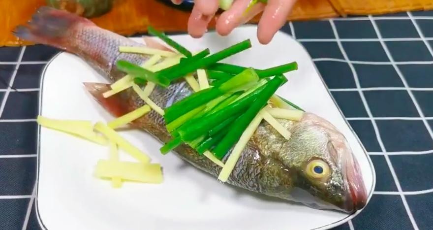 1条鲈鱼、小葱、生姜、白砂糖、生抽、料酒